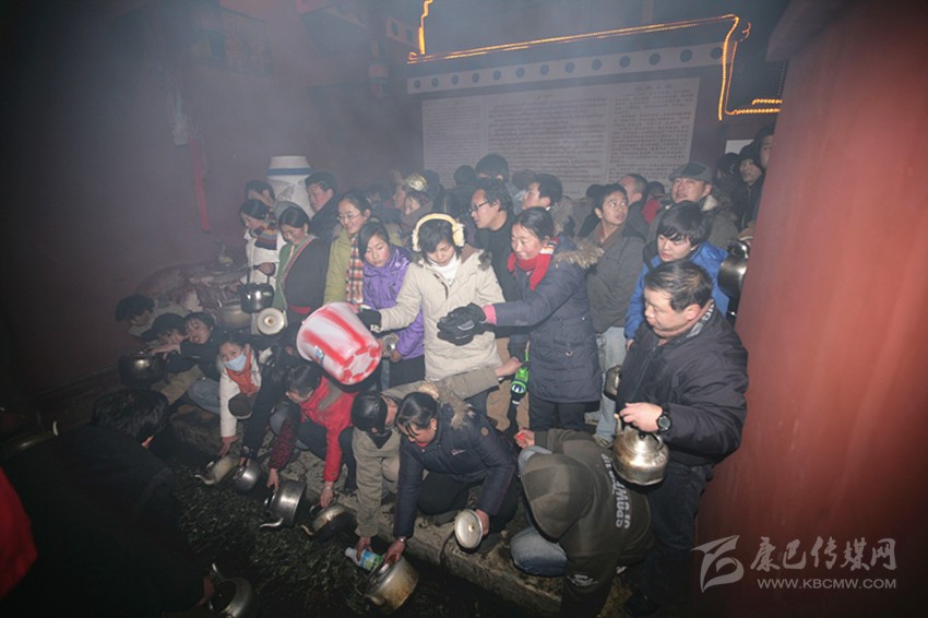 “每年大年三十我都會在這里來搶頭水,傳說郭達山神和跑馬山仙女會化身為一對金鴨在里面戲水。老人們說大年三十到正月初一‘翻年’那個節(jié)點來取水,就能看見金鴨,而水也等同于仙液?!痹趧倓偰隄M40歲的陳先生兒時的記憶中,這里每到春節(jié)“就會有人提著水桶,拿起茶壺排起長龍來看金鴨,搶頭水。”