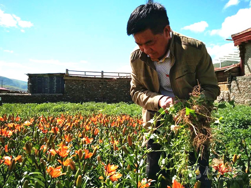 4月的蝦拉沱,土地剛剛從冰凍中復(fù)蘇,老老少少來往穿梭于曾經(jīng)種植青稞和土地的土地上,在技術(shù)人員的指導(dǎo)下,小心翼翼地種下一株株百合。