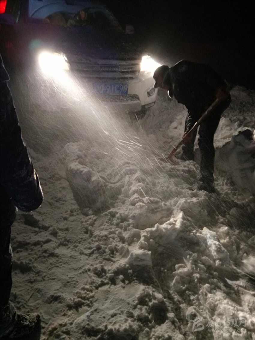 晚上10點多,第二次失敗的眾人,又開始進行第三次嘗試。“把車前的雪基本鏟出了可以供車子輪胎行駛?!眲⒎f說,這一次,在合力下,他的車被推了出來。并且借助大貨車壓過的車輪印,成功掉了頭。