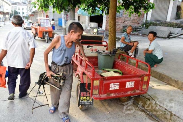 8月15日清晨不到7點(diǎn),在四川省南部縣中心鄉(xiāng)漏米巖村,周強(qiáng)善正將補(bǔ)鞋工具搬上機(jī)動(dòng)三輪車,準(zhǔn)備從家出發(fā)去鄰近的長坪鎮(zhèn)集市趕場。攝影 張可凡