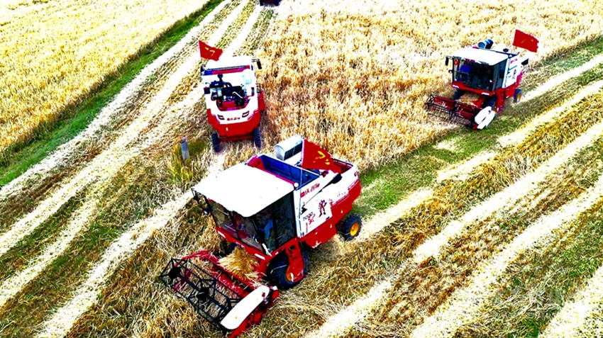 機(jī)械化收割青稞。