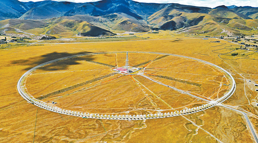 飛機(jī)從稻城亞丁機(jī)場(chǎng)起飛,右側(cè)舷窗外的地面隱現(xiàn)一個(gè)小圓點(diǎn),因?yàn)樵煨吞厥?,?dāng)?shù)厝朔Q“千眼天珠”。小圓點(diǎn)其實(shí)一點(diǎn)也不“小”——在海拔3820米的甘孜州稻城縣噶通鎮(zhèn),313部直徑6米的天線,均勻地分布在直徑1公里的圓環(huán)上。它的正式名字叫圓環(huán)陣太陽(yáng)射電成像望遠(yuǎn)鏡(下稱“圓環(huán)陣”),是國(guó)家重大科技基礎(chǔ)設(shè)施空間環(huán)境地基綜合監(jiān)測(cè)網(wǎng)(子午工程二期)的標(biāo)志性設(shè)備之一,也是目前已建成的全球規(guī)模最大的綜合孔徑射電望遠(yuǎn)鏡。其任務(wù)主要是對(duì)太陽(yáng)和日地空間傳播鏈條進(jìn)行高質(zhì)量監(jiān)測(cè),監(jiān)測(cè)太陽(yáng)“打噴嚏”。
