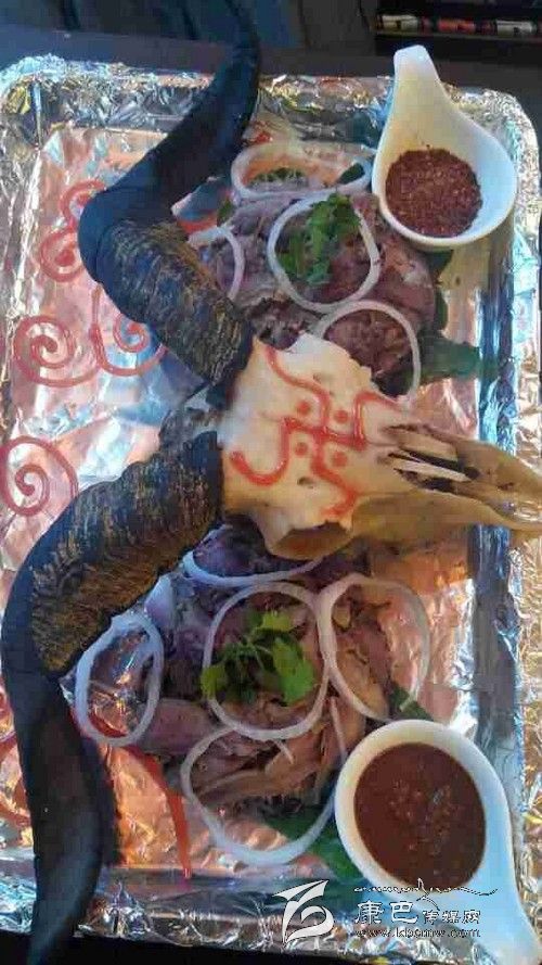 最值得一提的應(yīng)該是兩盤放在羊頭邊上的蘸料。一盤是四川的干辣椒面,里面放了鹽、味精、花椒,是大部分人都能接受的口味。而另一盤辣椒是西藏獨(dú)有的藏式辣椒醬,該辣椒的香辣和印度魔鬼椒有得一拼。藏式辣椒是使用涼水調(diào)和而成,只放一些鹽在里面,用羊頭肉沾上那么一點(diǎn)放在嘴里,立刻能感覺到辣味直襲你的味蕾神經(jīng)進(jìn)入你的大腦,形成一個字“辣”。如果你是不怕的,喜歡吃辣的食客,不妨試試這道“吉祥羊頭”帶給你的火爆。