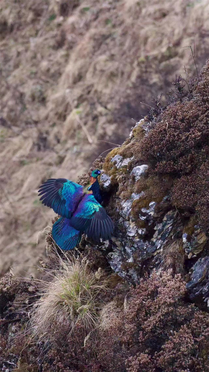據(jù)了解,綠尾虹雉屬雞形目雉科,羽毛多彩絢麗,有著“蜀山彩虹”的美譽(yù)。綠尾虹雉以植物的嫩葉、花蕾、嫩枝、幼芽和種子等為食,它們棲息于海拔3000米至5000米的針葉林、高山草甸、灌叢和裸巖地帶,每年4-5月繁殖。是我國的特產(chǎn)種類,分布于四川、云南西北部、西藏東南部、甘肅東南部和青海南部一帶,珍稀程度堪比大熊貓。
